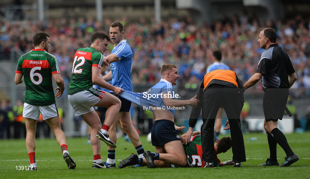17 September 2017; Diarmuid O'Connor of Mayo pulls the jersey of Ciarán Kilkenny of Dublin during the GAA Football All-Ireland Senior Championship Final match between Dublin and Mayo at Croke Park in Dublin. Photo by Piaras Ó Mídheach/Sportsfile
