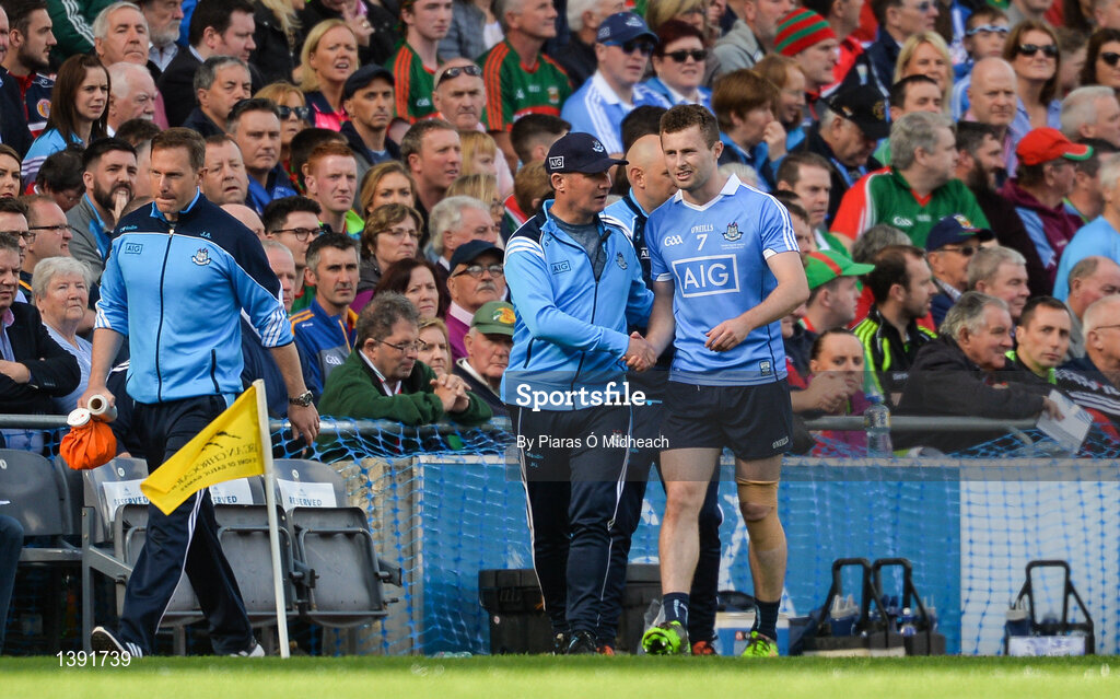 17 September 2017; Jack McCaffrey of Dublin with manager Jim Gavin after leaving the field with an injury during the GAA Football All-Ireland Senior Championship Final match between Dublin and Mayo at Croke Park in Dublin. Photo by Piaras Ó Mídheach/Sportsfile