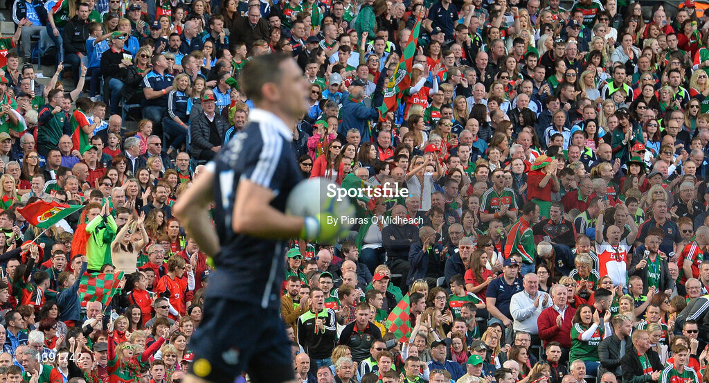 17 September 2017; Mayo supporters celebrate a score as Dublin goalkeeper Stephen Cluxton prepares to take a kickout during the GAA Football All-Ireland Senior Championship Final match between Dublin and Mayo at Croke Park in Dublin. Photo by Piaras Ó Mídheach/Sportsfile