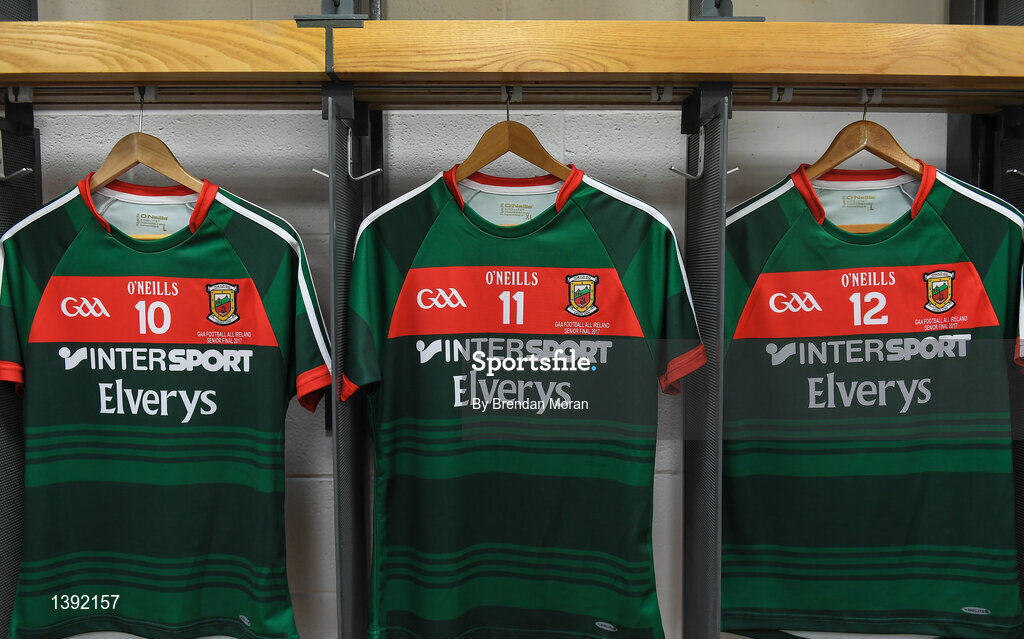 17 September 2017; The jerseys of Kevin McLoughlin, Aidan O'Shea and Diarmuid O'Connor of Mayo hang in the Mayo dressing room prior to the GAA Football All-Ireland Senior Championship Final match between Dublin and Mayo at Croke Park in Dublin. Photo by Brendan Moran/Sportsfile