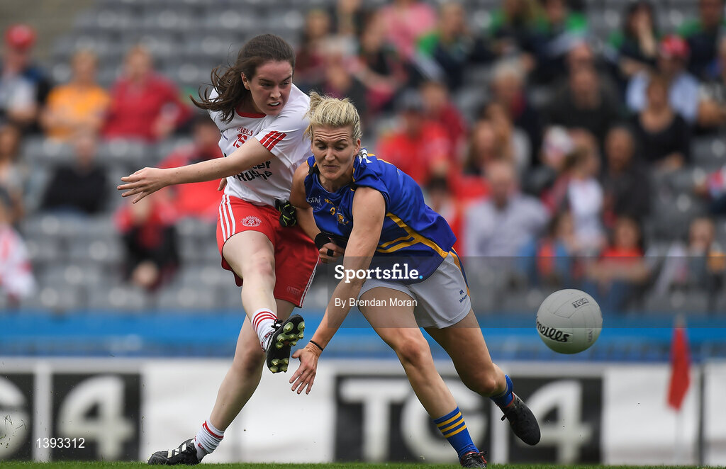 24 September 2017; Gráinne Rafferty of Tyrone scores her side's first goal despite the best efforts of Jennifer Grant of Tipperary during the TG4 Ladies Football All-Ireland Intermediate Championship Final match between Tipperary and Tyrone at Croke Park in Dublin. Photo by Brendan Moran/Sportsfile