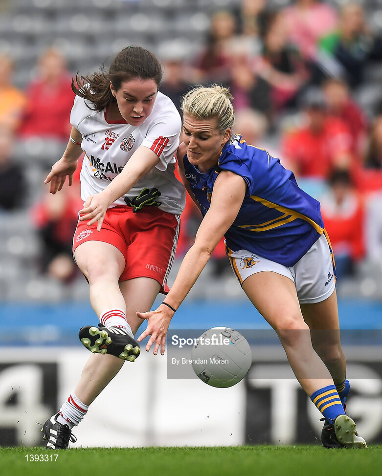 24 September 2017; Gráinne Rafferty of Tyrone scores her side's first goal despite the best efforts of Jennifer Grant of Tipperary during the TG4 Ladies Football All-Ireland Intermediate Championship Final match between Tipperary and Tyrone at Croke Park in Dublin. Photo by Brendan Moran/Sportsfile