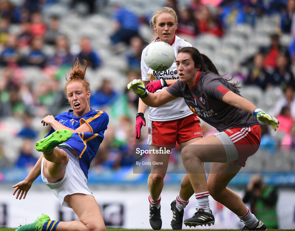 24 September 2017; Aishling Moloney of Tipperary shoots past Tyrone goalkeeper Shannon Lynch resulting in a point during the TG4 Ladies Football All-Ireland Intermediate Championship Final match between Tipperary and Tyrone at Croke Park in Dublin. Photo by Cody Glenn/Sportsfile