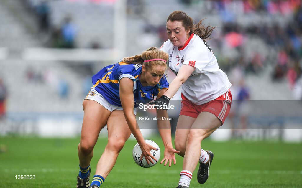 24 September 2017; Niamh Lonergan of Tipperary in action against Christiane Hunter of Tyrone during the TG4 Ladies Football All-Ireland Intermediate Championship Final match between Tipperary and Tyrone at Croke Park in Dublin. Photo by Brendan Moran/Sportsfile