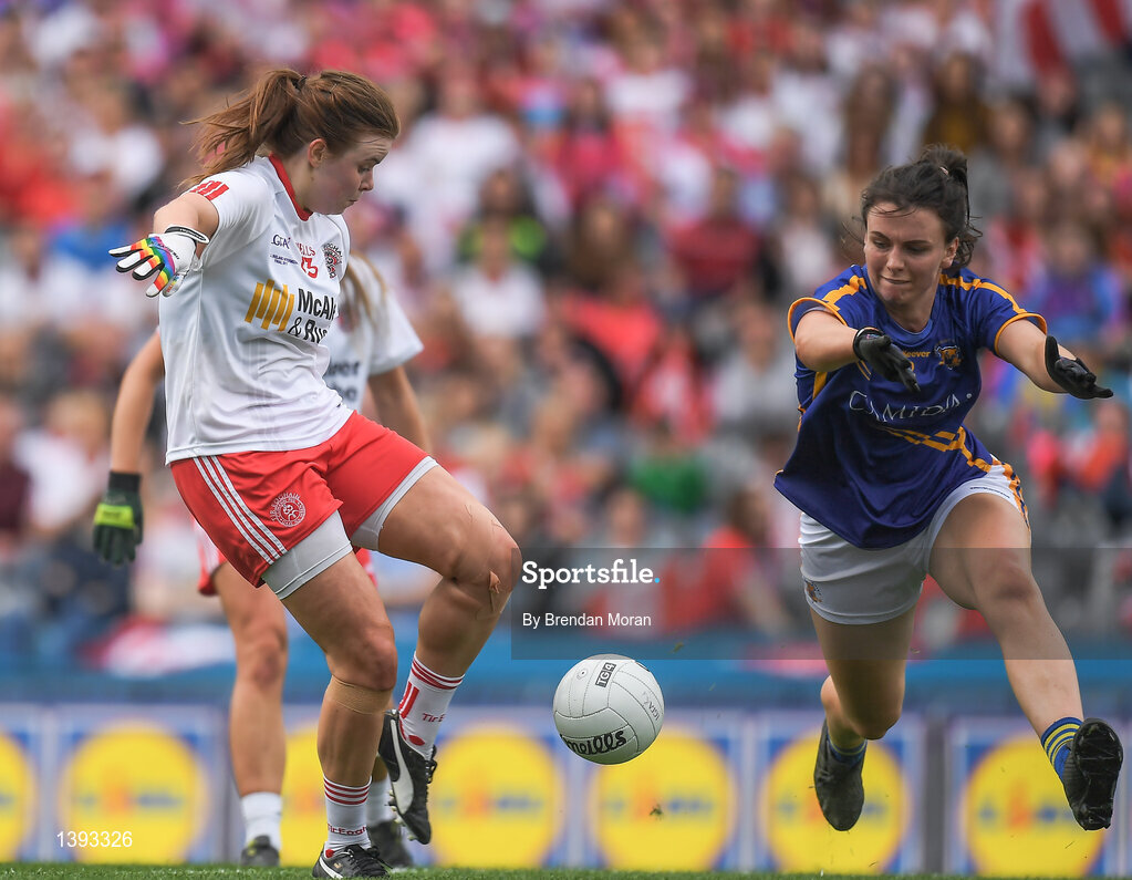 24 September 2017; Niamh O'Neill of Tyrone in action against Siobhán Condon of Tipperary during the TG4 Ladies Football All-Ireland Intermediate Championship Final match between Tipperary and Tyrone at Croke Park in Dublin. Photo by Brendan Moran/Sportsfile