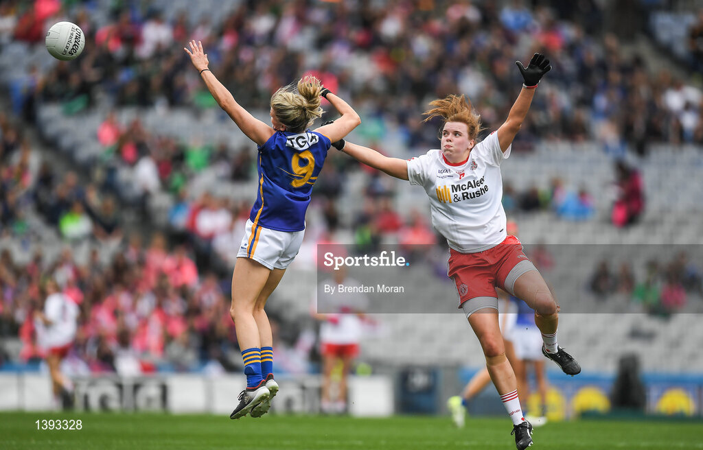 24 September 2017; Jennifer Grant of Tipperary in action against Niamh O'Neill of Tyrone during the TG4 Ladies Football All-Ireland Intermediate Championship Final match between Tipperary and Tyrone at Croke Park in Dublin. Photo by Brendan Moran/Sportsfile