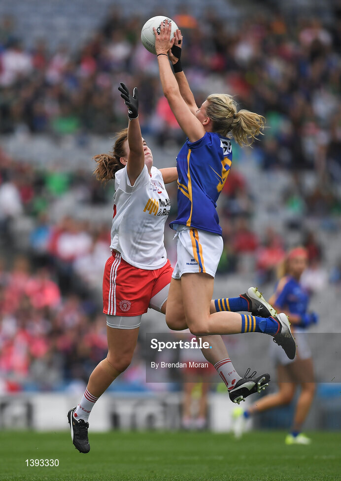 24 September 2017; Jennifer Grant of Tipperary in action against Niamh O'Neill of Tyrone during the TG4 Ladies Football All-Ireland Intermediate Championship Final match between Tipperary and Tyrone at Croke Park in Dublin. Photo by Brendan Moran/Sportsfile