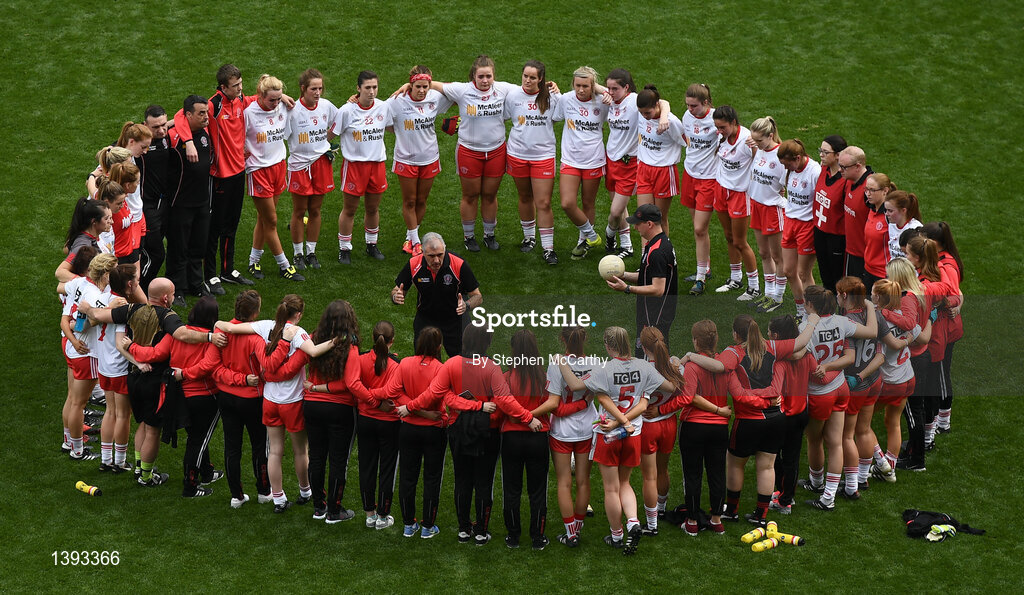 24 September 2017; Tyrone manager Gerry Moane speak to his players following the TG4 Ladies Football All-Ireland Intermediate Championship Final match between Tipperary and Tyrone at Croke Park in Dublin. Photo by Stephen McCarthy/Sportsfile