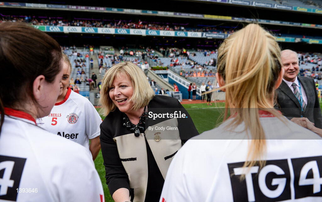 24 September 2017; LGPA President Marie Hickey meets the Tyrone team ahead of the TG4 Ladies Football All-Ireland Intermediate Championship Final match between Tipperary and Tyrone at Croke Park in Dublin. Photo by Cody Glenn/Sportsfile