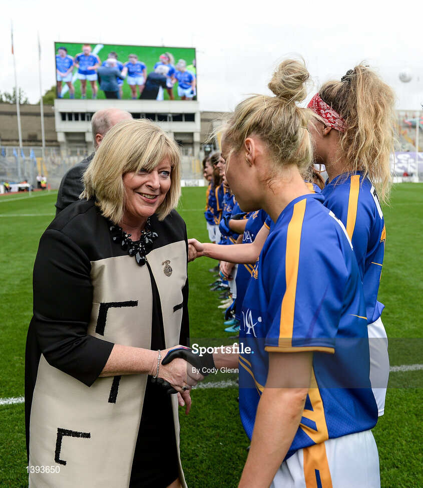 24 September 2017; LGPA President Marie Hickey meets the Tipperary team ahead of the TG4 Ladies Football All-Ireland Intermediate Championship Final match between Tipperary and Tyrone at Croke Park in Dublin. Photo by Cody Glenn/Sportsfile