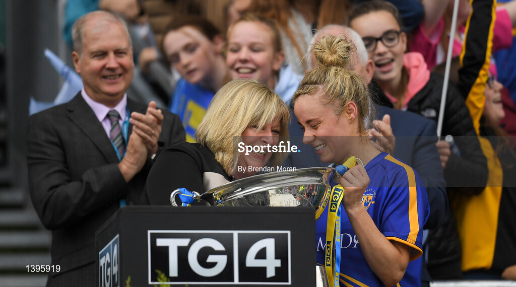 24 September 2017; Tipperary captain Samantha Lambert is presented with the Mary Quinn Memorial Cup by Maire Hickey, President, LFGA, after the TG4 Ladies Football All-Ireland Intermediate Championship Final match between Tipperary and Tyrone at Croke Park in Dublin. Photo by Brendan Moran/Sportsfile