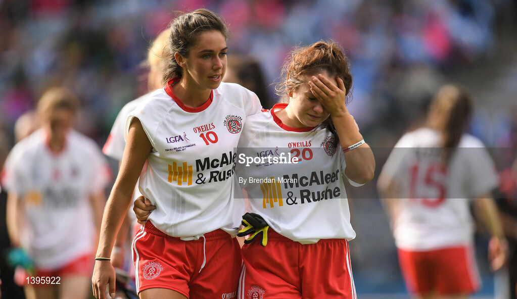 24 September 2017; Niamh Hughes , left, and Emma Smyth of Tyrone after the TG4 Ladies Football All-Ireland Intermediate Championship Final match between Tipperary and Tyrone at Croke Park in Dublin. Photo by Brendan Moran/Sportsfile