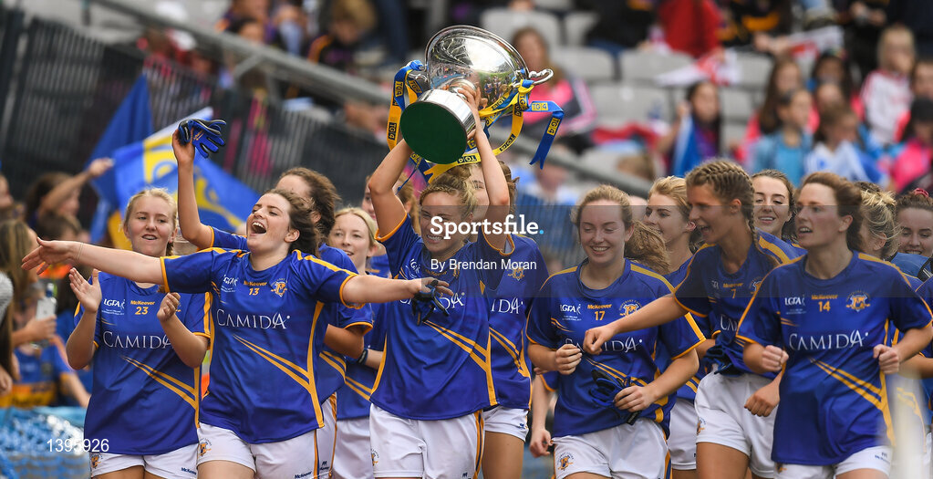24 September 2017; The Tipperary team celebrate with the cup after the TG4 Ladies Football All-Ireland Intermediate Championship Final match between Tipperary and Tyrone at Croke Park in Dublin. Photo by Brendan Moran/Sportsfile