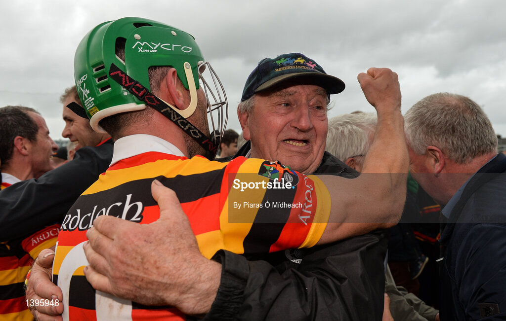 1 October 2017; Tony of Spain of Ardclough celebrates with Ardclough Hurling Chairman Noel Burke after the Kildare County Senior Hurling Championship Final match between Ardclough and Naas at St Conleth's Park in Newbridge, Co. Kildare. Photo by Piaras Ó Mídheach/Sportsfile