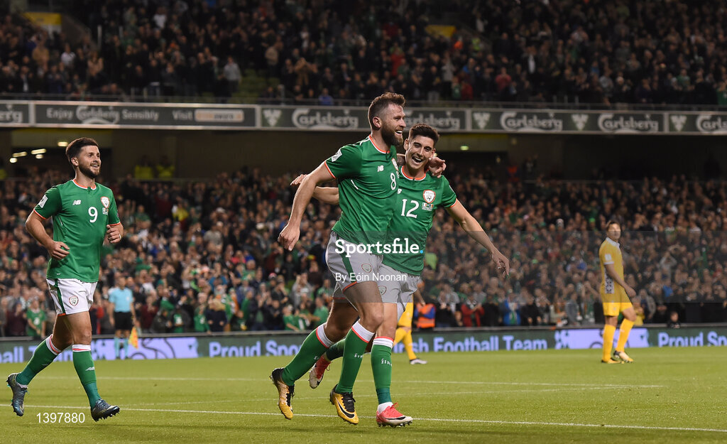 6 October 2017; Daryl Murphy, left, of Republic of Ireland celebrates with team-mate Callum O'Dowda after scoring his side's second goal during the FIFA World Cup Qualifier Group D match between Republic of Ireland and Moldova at Aviva Stadium in Dublin. Photo by Eóin Noonan/Sportsfile