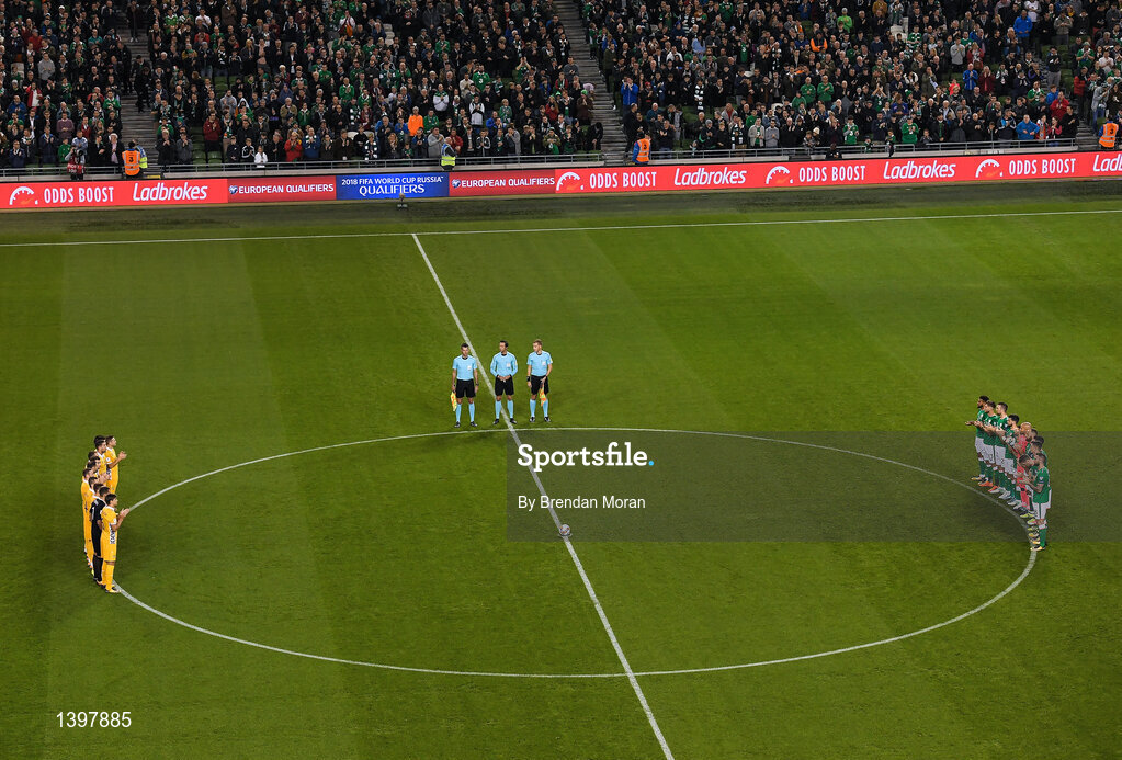 6 October 2017; Republic of Ireland and Moldova teams stand for a minutes applause for Jimmy Magee prior to the FIFA World Cup Qualifier Group D match between Republic of Ireland and Moldova at Aviva Stadium in Dublin. Photo by Brendan Moran/Sportsfile