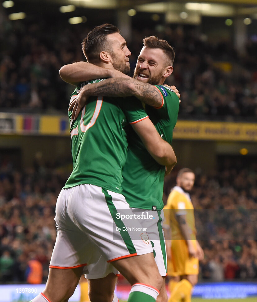 6 October 2017; Daryl Murphy, right, of Republic of Ireland celebrates with teammate Shane Duffy after scoring his side's first goal during the FIFA World Cup Qualifier Group D match between Republic of Ireland and Moldova at Aviva Stadium in Dublin. Photo by Eóin Noonan/Sportsfile