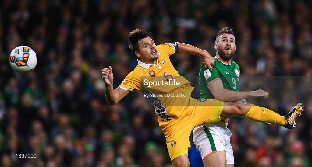 6 October 2017; Alexandru Epureanu of Moldova in action against Daryl Murphy of Republic of Ireland during the FIFA World Cup Qualifier Group D match between Republic of Ireland and Moldova at Aviva Stadium in Dublin. Photo by Stephen McCarthy/Sportsfile