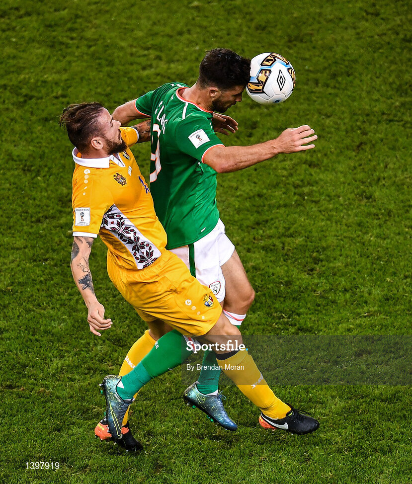 6 October 2017; Shane Long of Republic of Ireland in action against Petru Racu of Moldova during the FIFA World Cup Qualifier Group D match between Republic of Ireland and Moldova at Aviva Stadium in Dublin. Photo by Brendan Moran/Sportsfile