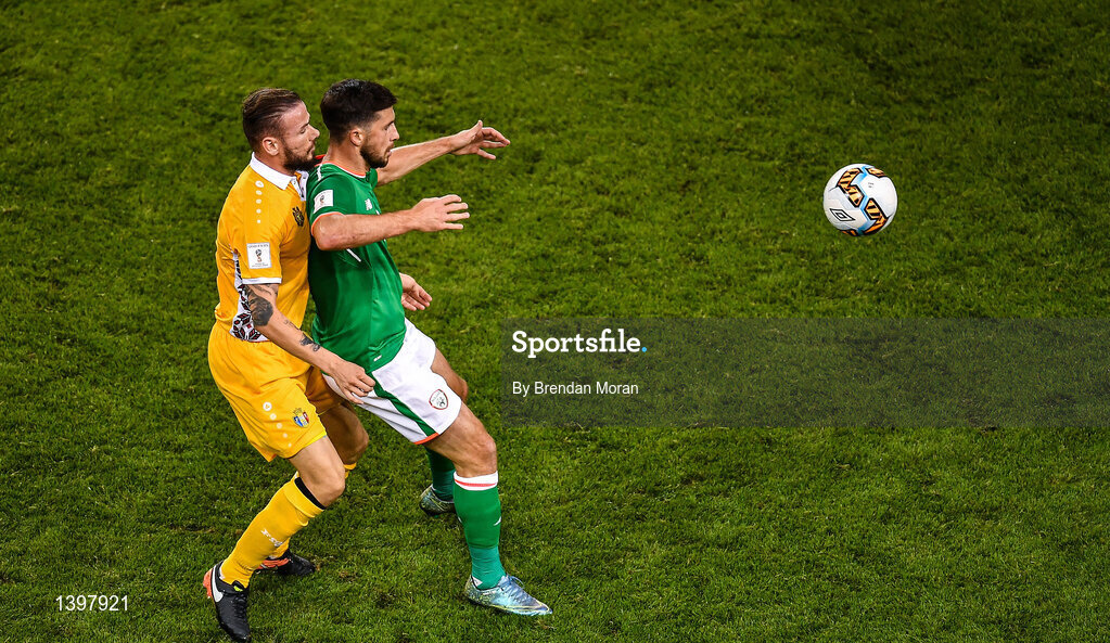 6 October 2017; Shane Long of Republic of Ireland in action against Petru Racu of Moldova during the FIFA World Cup Qualifier Group D match between Republic of Ireland and Moldova at Aviva Stadium in Dublin. Photo by Brendan Moran/Sportsfile