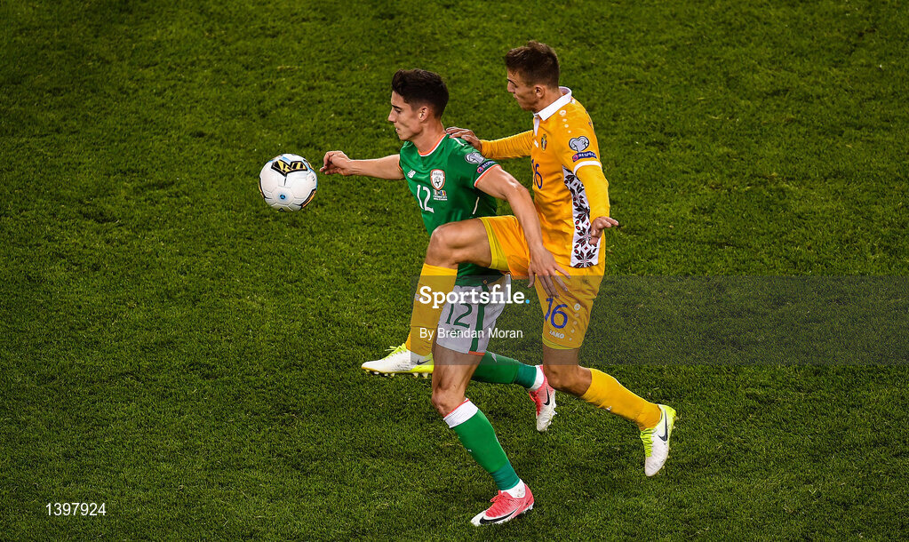6 October 2017; Callum O'Dowda of Republic of Ireland in action against Sergiu Platica of Moldova during the FIFA World Cup Qualifier Group D match between Republic of Ireland and Moldova at Aviva Stadium in Dublin. Photo by Brendan Moran/Sportsfile