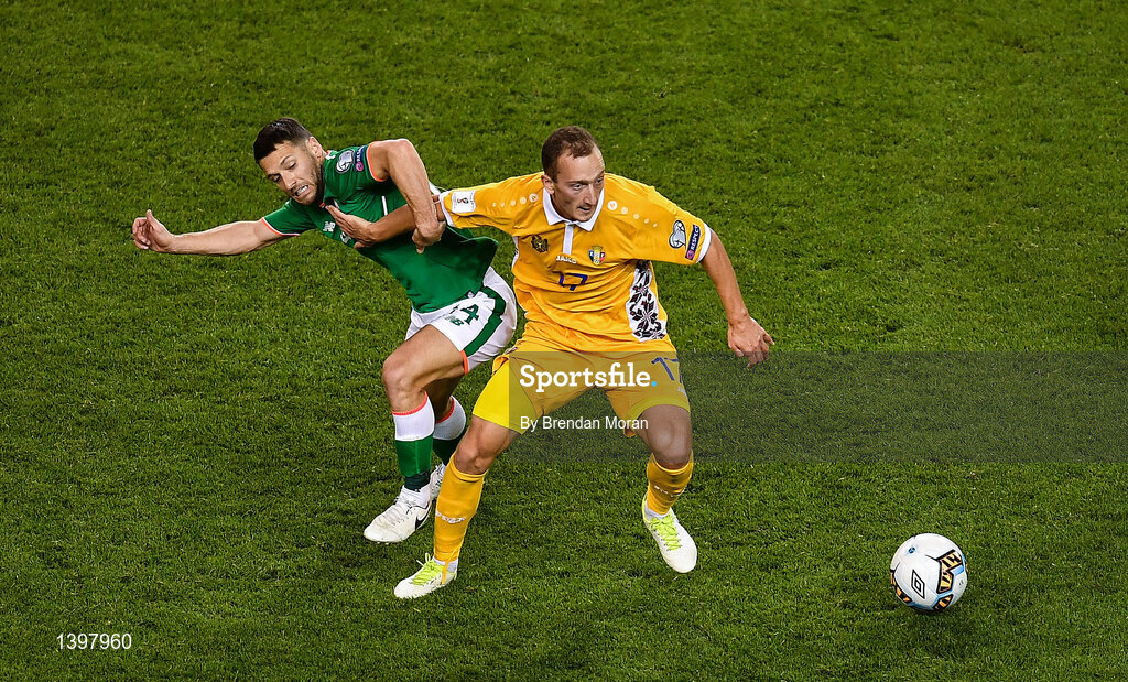 6 October 2017; Gheorghe Anton of Moldova in action against Wes Hoolahan of Republic of Ireland during the FIFA World Cup Qualifier Group D match between Republic of Ireland and Moldova at Aviva Stadium in Dublin. Photo by Brendan Moran/Sportsfile