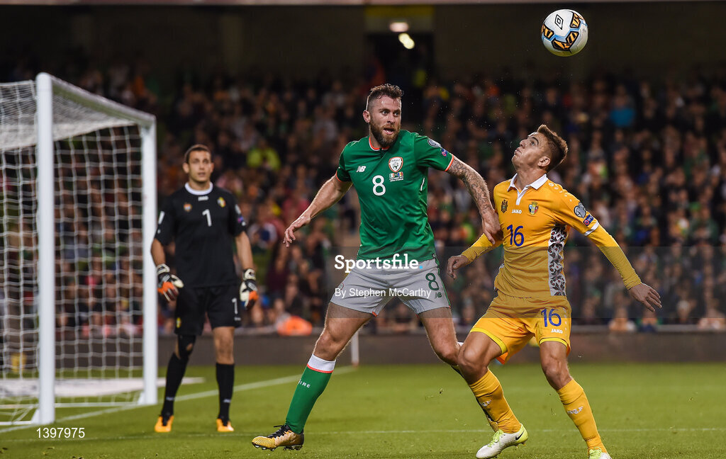 6 October 2017; Sergiu Platica of Moldova in action against Daryl Murphy of Republic of Ireland during the FIFA World Cup Qualifier Group D match between Republic of Ireland and Moldova at Aviva Stadium in Dublin. Photo by Stephen McCarthy/Sportsfile