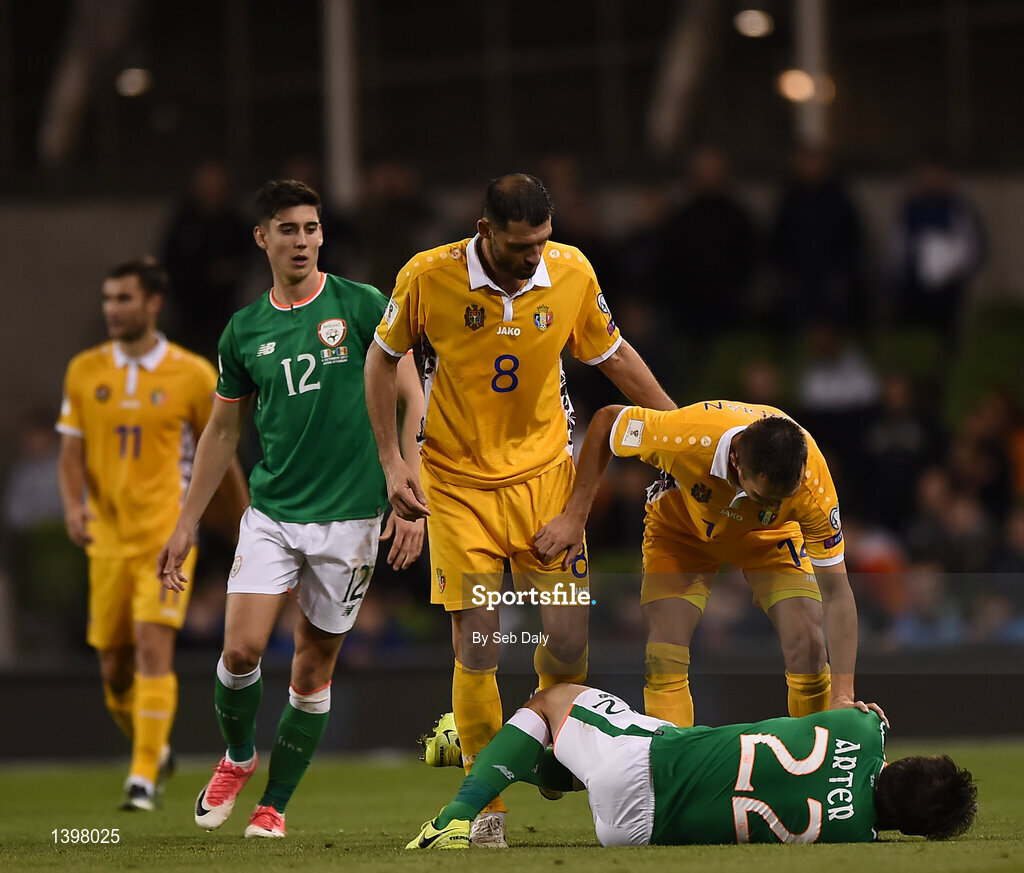 6 October 2017; Harry Arter of Republic of Ireland falls to the floor after an altercation with Alexandru Gatcan of Moldova, left, during the FIFA World Cup Qualifier Group D match between Republic of Ireland and Moldova at Aviva Stadium in Dublin. Photo by Seb Daly/Sportsfile