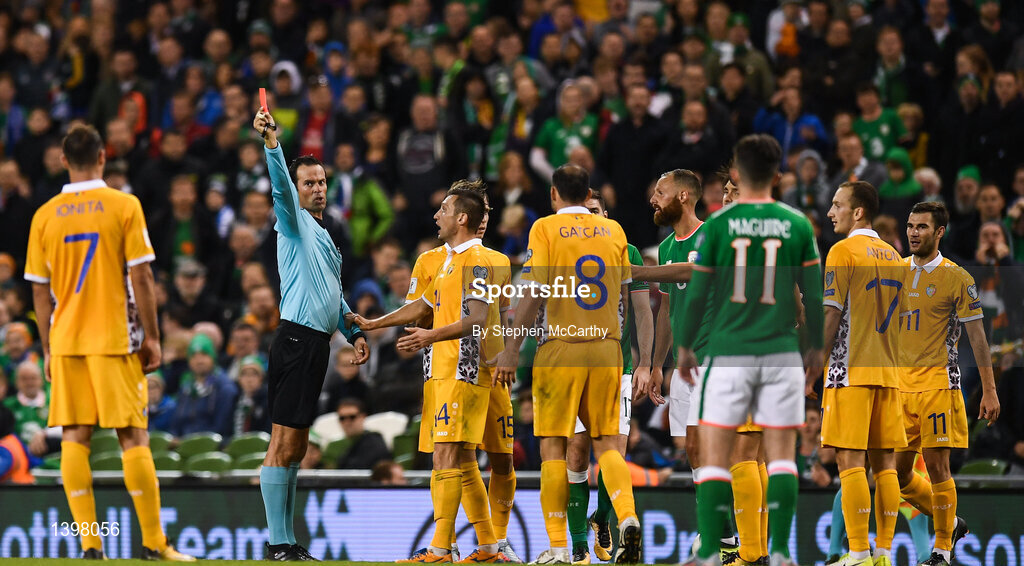 6 October 2017; Alexandru Gatcan, 8, of Moldova receives a red card from referee Bas Nijhuis during the FIFA World Cup Qualifier Group D match between Republic of Ireland and Moldova at Aviva Stadium in Dublin. Photo by Stephen McCarthy/Sportsfile