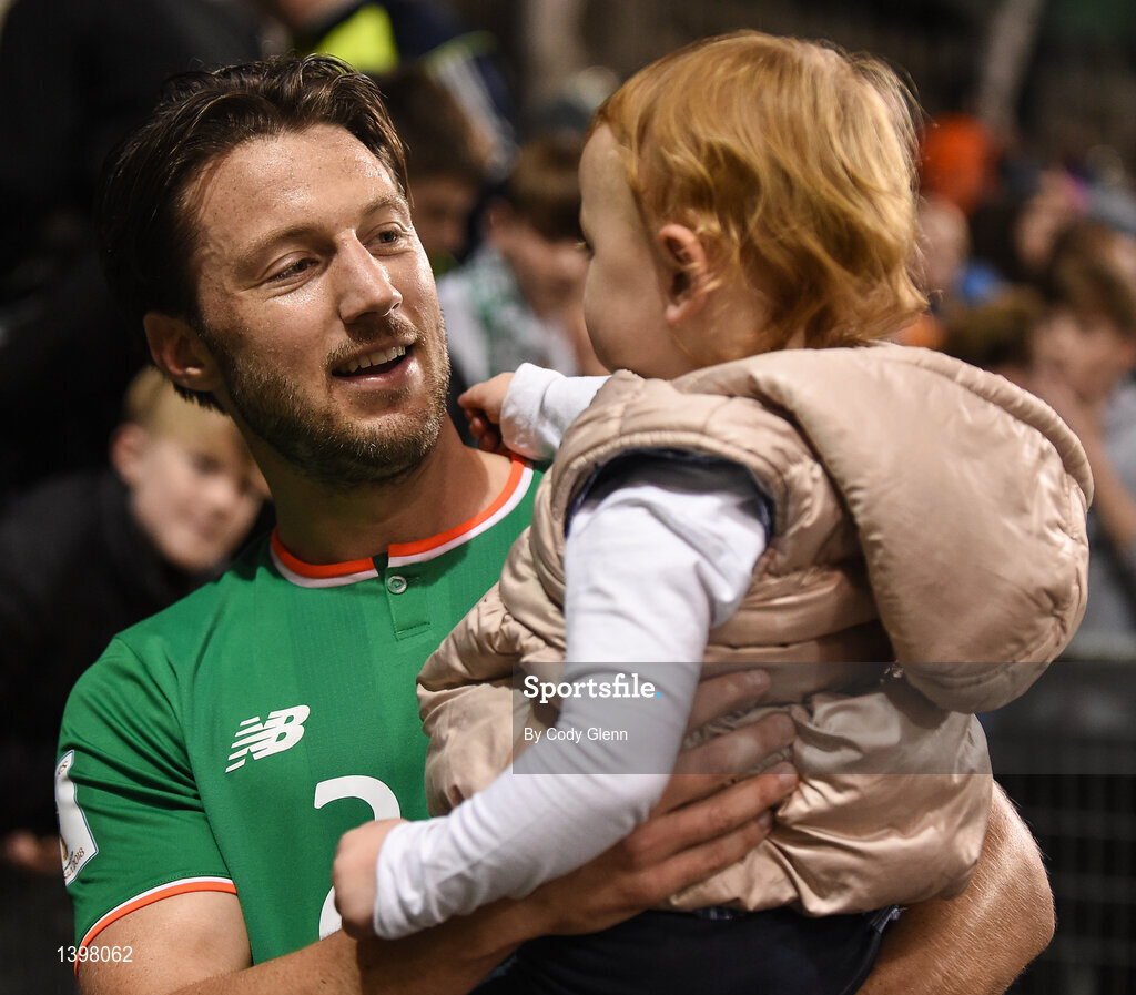 6 October 2017; Harry Arter of Republic of Ireland picks up Republic of Ireland supporter Kayleigh Murphy, age 2, from Roundwood, Co Wicklow after the FIFA World Cup Qualifier Group D match between Republic of Ireland and Moldova at Aviva Stadium in Dublin. Photo by Cody Glenn/Sportsfile
