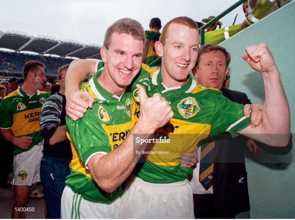28 September 1997; Brothers Mike, left, and Kerry captain Liam Hassett celebrate after GAA Football All-Ireland Senior Championship Final match between Kerry and Mayo at Croke Park in Dublin. Photo by Brendan Moran/Sportsfile
