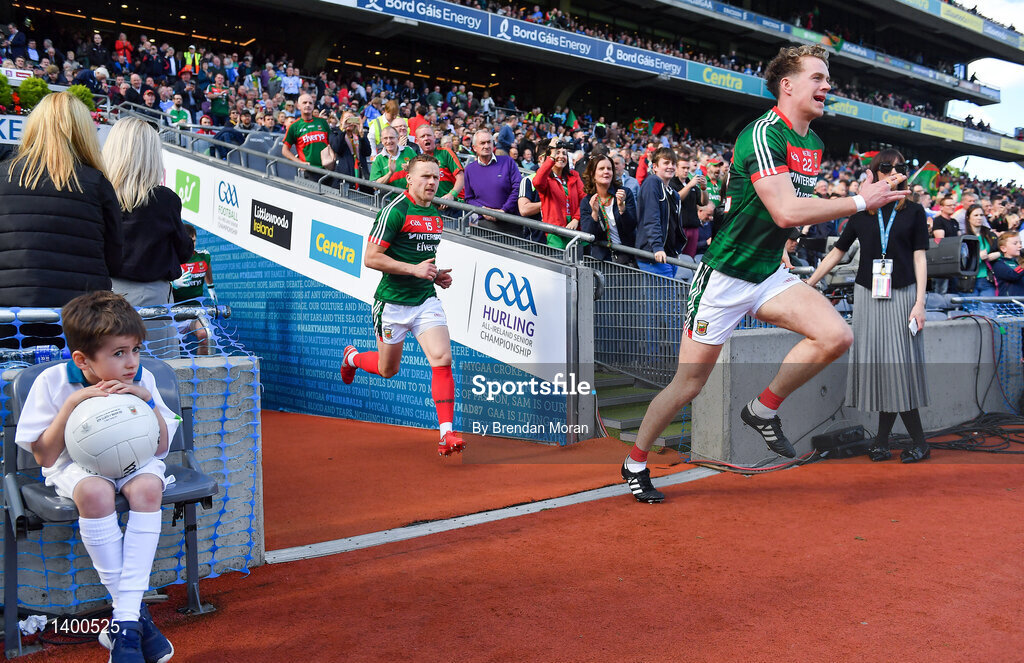 17 September 2017; Ball boy Donnacha Judge looks on as the Mayoo team run onto the pitch prior to the GAA Football All-Ireland Senior Championship Final match between Dublin and Mayo at Croke Park in Dublin. Photo by Brendan Moran/Sportsfile