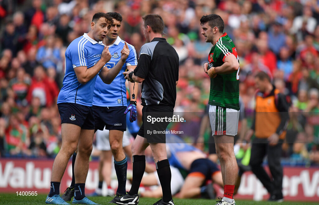 17 September 2017; Cormac Costello of Dublin speaks to Referee Joe McQuillan after a tussle with Brendan Harrison of Mayo during the GAA Football All-Ireland Senior Championship Final match between Dublin and Mayo at Croke Park in Dublin. Photo by Brendan Moran/Sportsfile