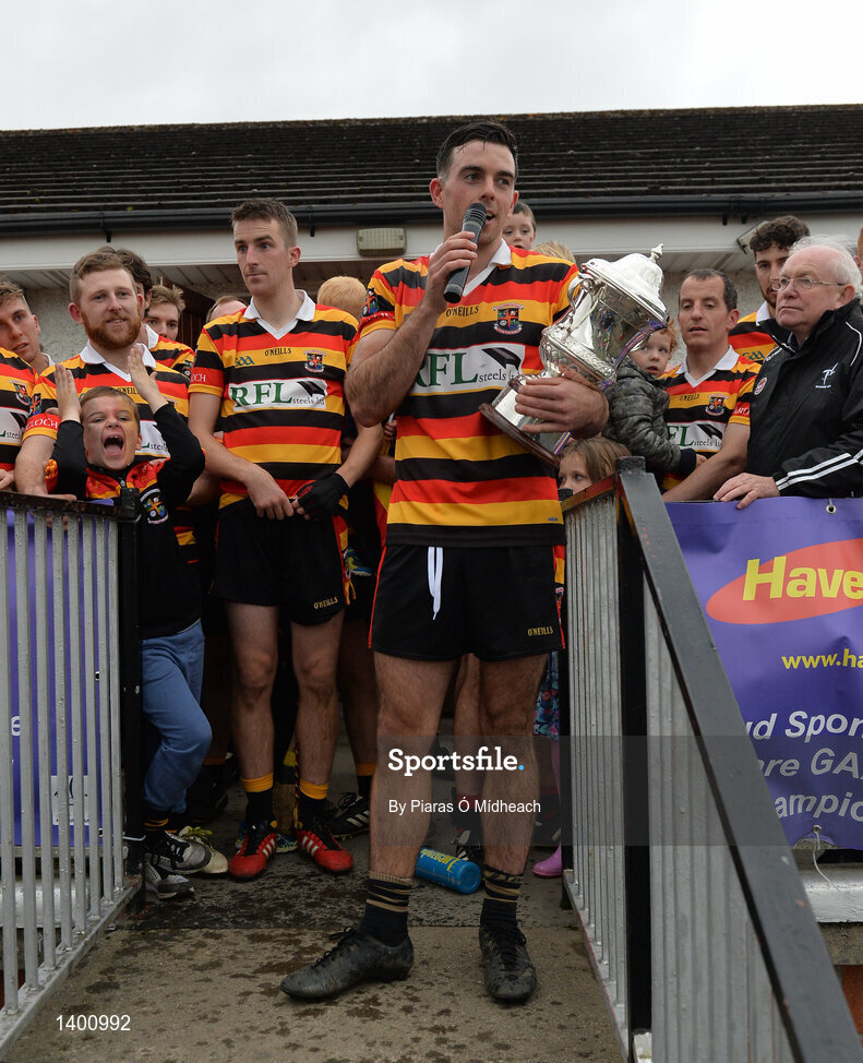 1 October 2017; Ardclough captain Paudie Ryan gives his acceptance speech after the Kildare County Senior Hurling Championship Final match between Ardclough and Naas at St Conleth's Park in Newbridge, Co. Kildare. Photo by Piaras Ó Mídheach/Sportsfile