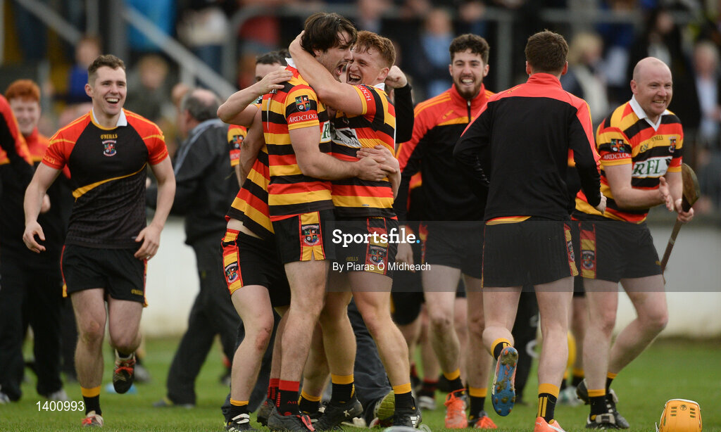 1 October 2017; Ardclough's Matt Stapleton and Seán Buggy, right, celebrate after the Kildare County Senior Hurling Championship Final match between Ardclough and Naas at St Conleth's Park in Newbridge, Co. Kildare. Photo by Piaras Ó Mídheach/Sportsfile