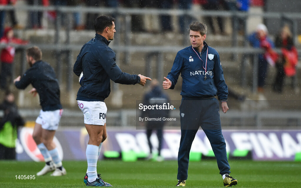 21 October 2017; Racing 92 defence coach Ronan O'Gara, right, with Dan Carter of Racing 92, ahead of the European Rugby Champions Cup Pool 4 Round 2 match between Munster and Racing 92 at Thomond Park in Limerick Photo by Diarmuid Greene/Sportsfile