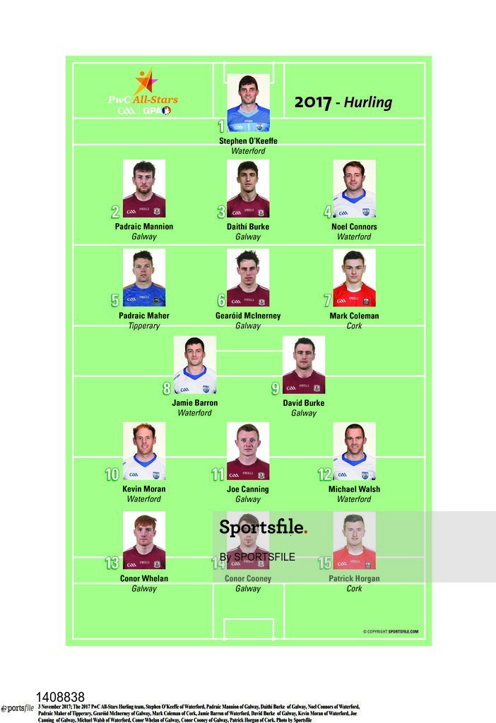 3 November 2017; The 2017 PwC All-Stars Hurling team, Stephen O’Keeffe of Waterford, Padraic Mannion of Galway, Daithí Burke of Galway, Noel Connors of Waterford, Padraic Maher of Tipperary, Gearóid McInerney of Galway, Mark Coleman of Cork, Jamie Barron of Waterford, David Burke of Galway, Kevin Moran of Waterford, Joe Canning of Galway, Michael Walsh of Waterford, Conor Whelan of Galway, Conor Cooney of Galway, Patrick Horgan of Cork. Photo by Sportsfile