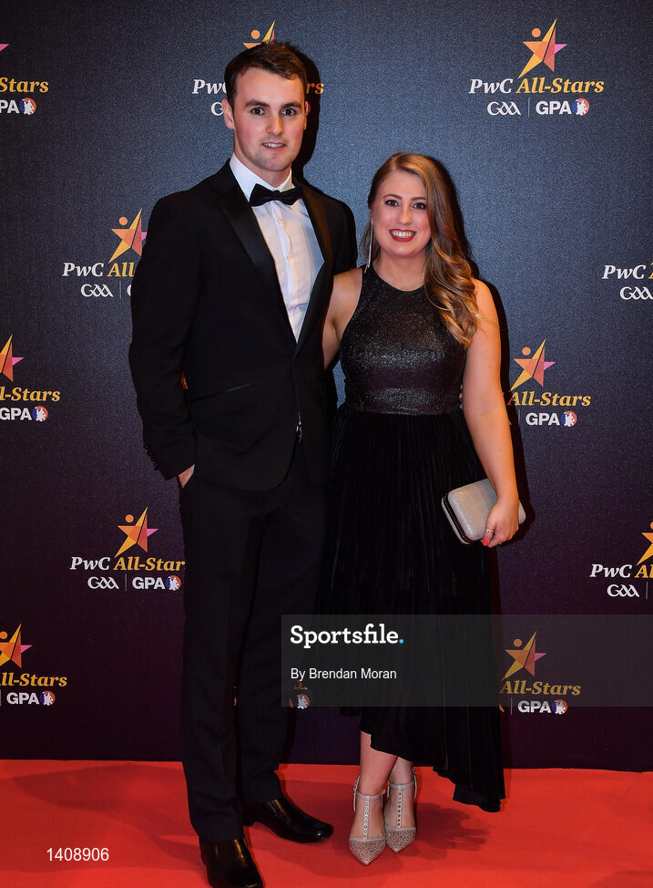 3 November 2017; Galway hurler Johnny Coen with Meadbh Lawless upon arrival at the PwC All Stars 2017 at the Convention Centre in Dublin. Photo by Brendan Moran/Sportsfile