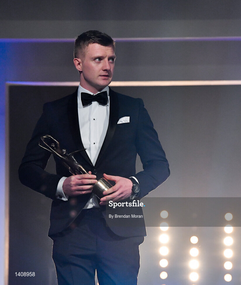 3 November 2017; Galway hurler Joe Canning with his award during the PwC All Stars 2017 at the Convention Centre in Dublin. Photo by Brendan Moran/Sportsfile