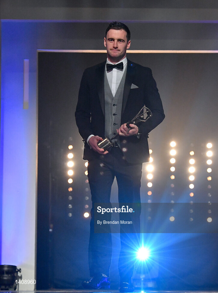 3 November 2017; Galway hurler David Burke with his award during the PwC All Stars 2017 at the Convention Centre in Dublin. Photo by Brendan Moran/Sportsfile