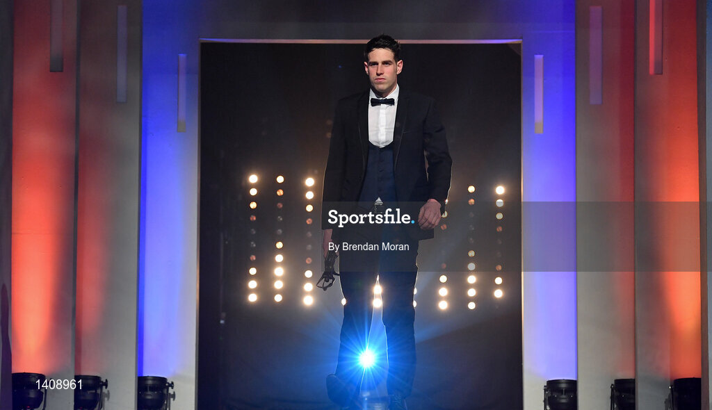 3 November 2017; Galway hurler Gearóid McInerney with his award during the PwC All Stars 2017 at the Convention Centre in Dublin. Photo by Brendan Moran/Sportsfile