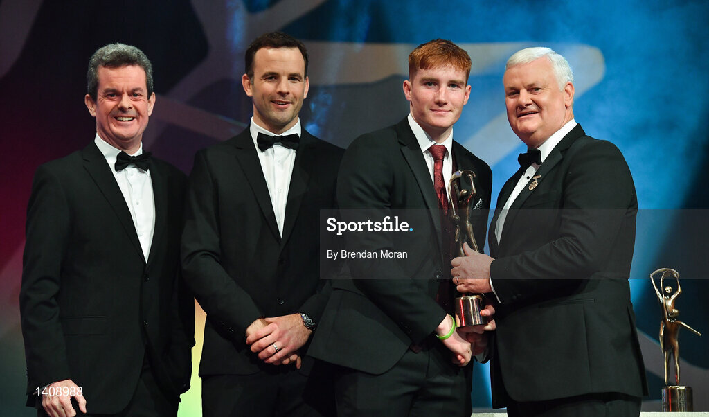 3 November 2017; Galway hurler Conor Whelan is presented with his PwC All Star award from Uachtarán Chumann Lúthchleas Gael Aogán Ó Fearghail, in the company of Feargal O'Rourke, left, Managing Partner, PwC, and David Collins, GPA President during the PwC All Stars 2017 at the Convention Centre in Dublin. Photo by Brendan Moran/Sportsfile