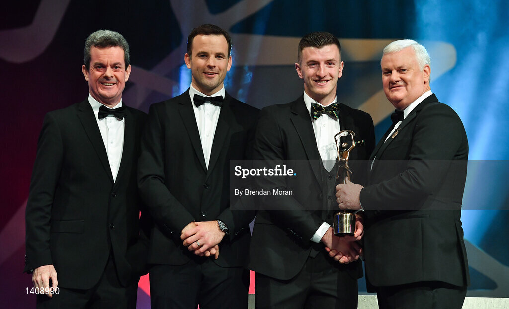 3 November 2017; Cork hurler Patrick Horgan is presented with his PwC All Star award from Uachtarán Chumann Lúthchleas Gael Aogán Ó Fearghail, in the company of Feargal O'Rourke, left, Managing Partner, PwC, and David Collins, GPA President during the PwC All Stars 2017 at the Convention Centre in Dublin. Photo by Brendan Moran/Sportsfile
