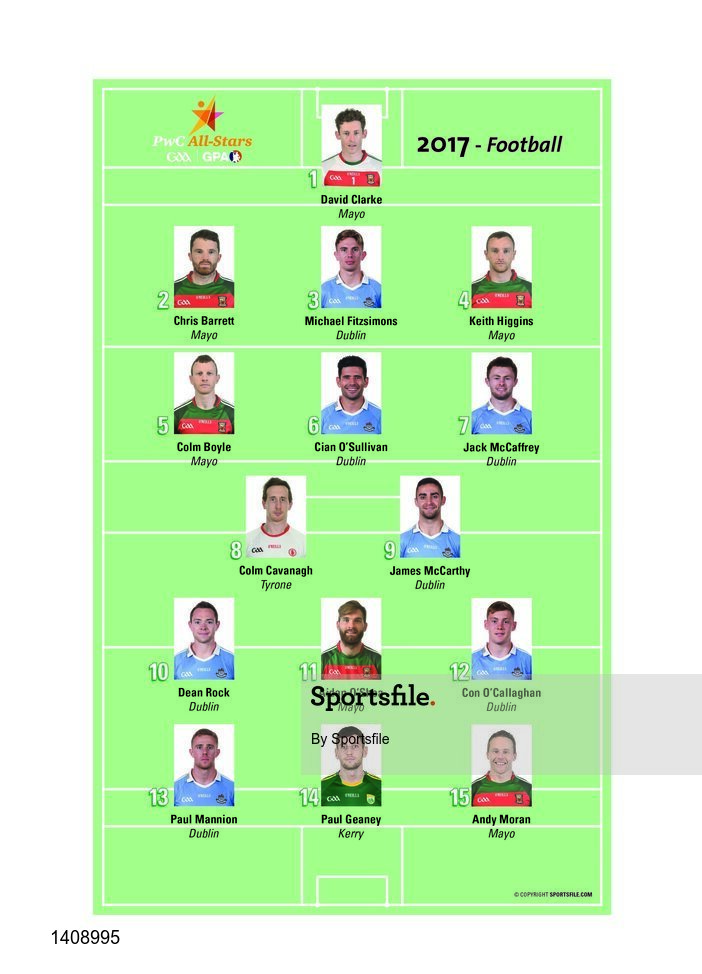 3 November 2017; The 2017 PwC All-Stars Football team, David Clarke of Mayo, Chris Barrett of Mayo, Michael Fitzsimons of Dublin, Keith Higgins of Mayo, Colm Boyle of Mayo, Cian O’Sullivan of Dublin, Jack McCaffrey of Dublin, Colm Cavanagh of Tyrone, James McCarthy of Dublin, Dean Rock of Dublin, Aidan O’Shea of Mayo, Con O’Callaghan of Dublin, Paul Mannion of Dublin, Paul Geaney of Kerry, Andy Moran of Mayo. Photo by Sportsfile