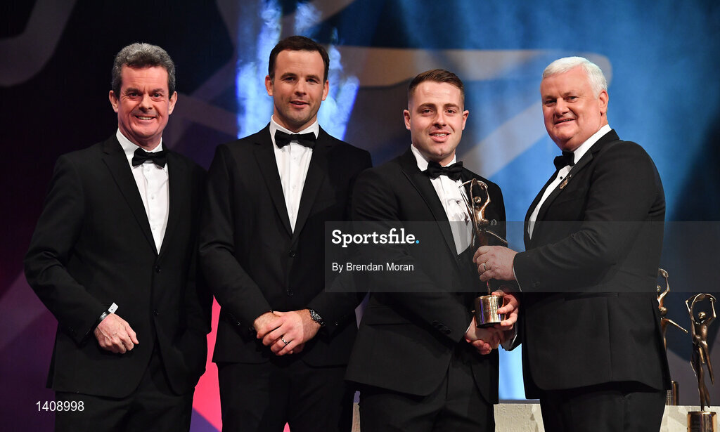 3 November 2017; Waterford hurler Noel Connors is presented with his PwC All Star award from Uachtarán Chumann Lúthchleas Gael Aogán Ó Fearghail, in the company of Feargal O'Rourke, left, Managing Partner, PwC, and David Collins, GPA President during the PwC All Stars 2017 at the Convention Centre in Dublin. Photo by Brendan Moran/Sportsfile