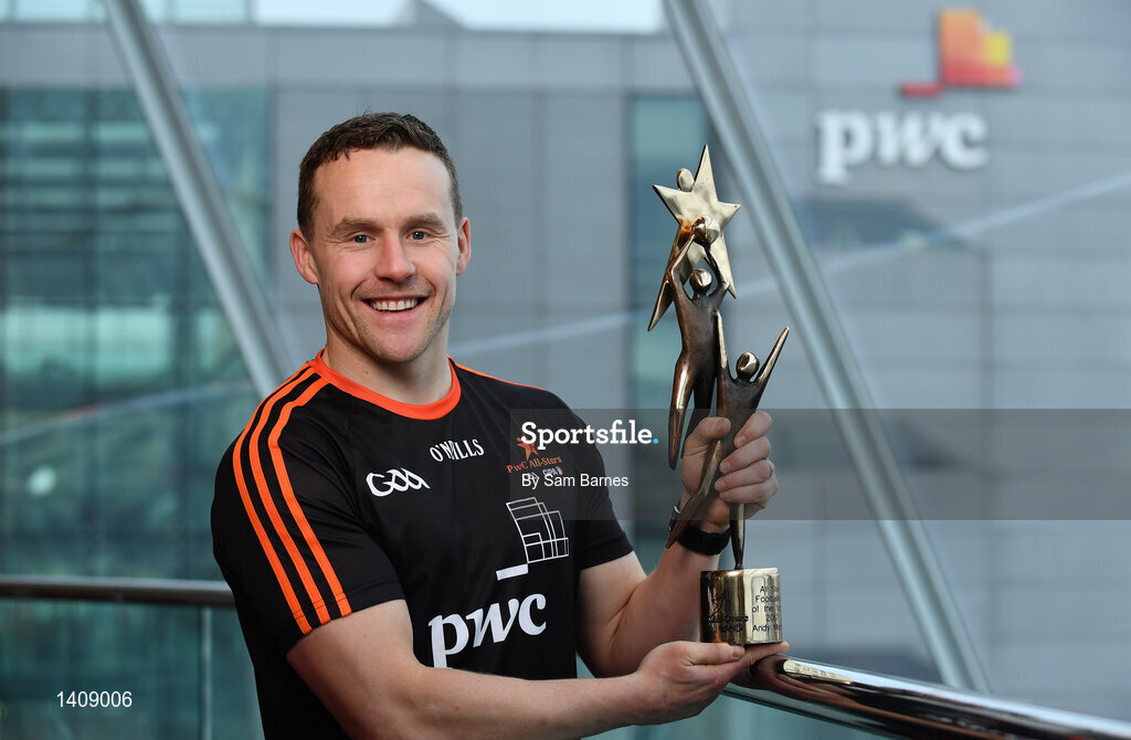 3 November 2017; Mayo Footballer Andy Moran with his PwC GAA/GPA Footballer of the Year Award at the PwC All Stars 2017 at the Convention Centre in Dublin. Photo by Sam Barnes/Sportsfile