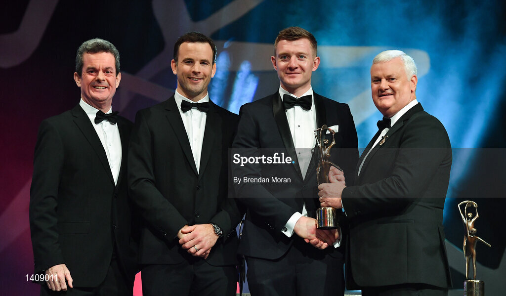 3 November 2017; Galway hurler Joe Canning is presented with his PwC All Star award from Uachtarán Chumann Lúthchleas Gael Aogán Ó Fearghail, in the company of Feargal O'Rourke, left, Managing Partner, PwC, and David Collins, GPA President during the PwC All Stars 2017 at the Convention Centre in Dublin. Photo by Brendan Moran/Sportsfile