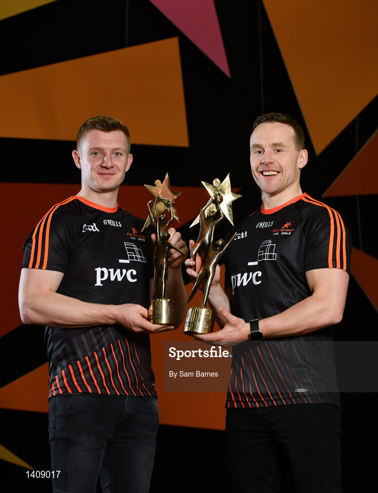 3 November 2017; Galway Hurler Joe Canning, left, and Mayo Footballer Andy Moran with their PwC GAA/GPA Hurler and Footballer of the Year Awards at the PwC All Stars 2017 at the Convention Centre in Dublin. Photo by Sam Barnes/Sportsfile