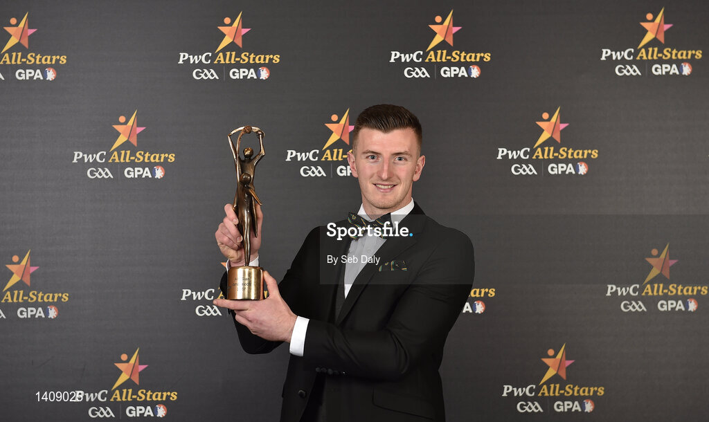 3 November 2017; Cork hurler Patrick Horgan with his All-Star award during the PwC All Stars 2017 at the Convention Centre in Dublin. Photo by Seb Daly/Sportsfile