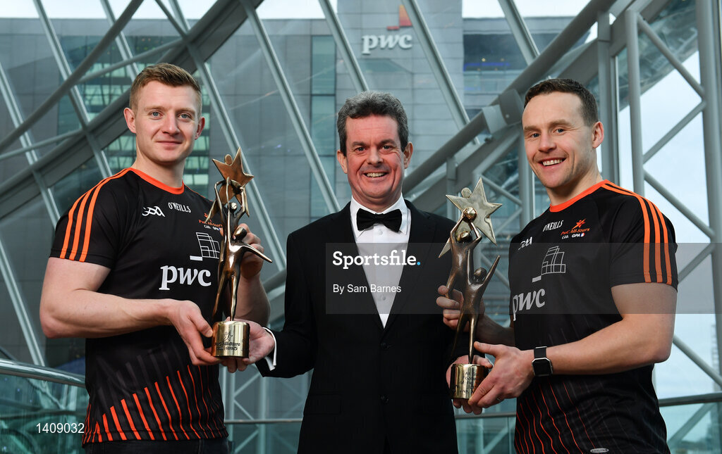 3 November 2017; Galway Hurler Joe Canning, left, and Mayo Footballer Andy Moran are presented with their PwC GAA/GPA Hurler and Footballer of the Year Awards by Feargal O'Rourke, Managing Partner, PwC, at the PwC All Stars 2017 at the Convention Centre in Dublin. Photo by Sam Barnes/Sportsfile